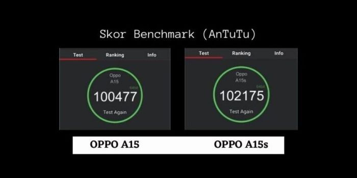 Khác biệt này cũng được thể hiện qua điểm benchmark trên phần mềm AnTuTu. OPPO A15 ghi được 100477 điểm, trong khi OPPO A15s có số điểm cao hơn là 102175 điểm.