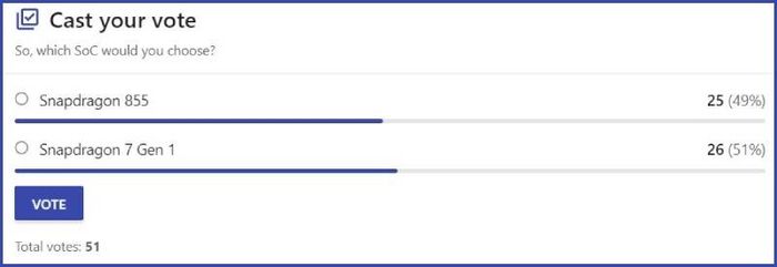 Tại Nanoreview, trong tổng số 51 lượt bầu chọn, Snapdragon 7 Gen 1 giành 26 phiếu (51%), còn Snapdragon 855 lọt ngỏm với 25 phiếu (49%) cho đến ngày 10/03/2023.