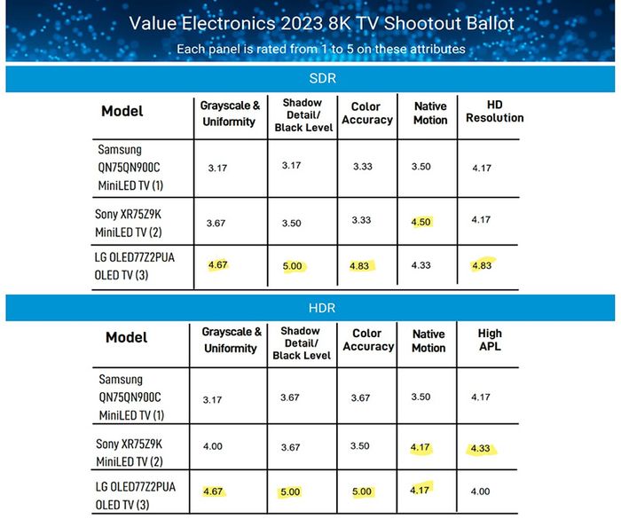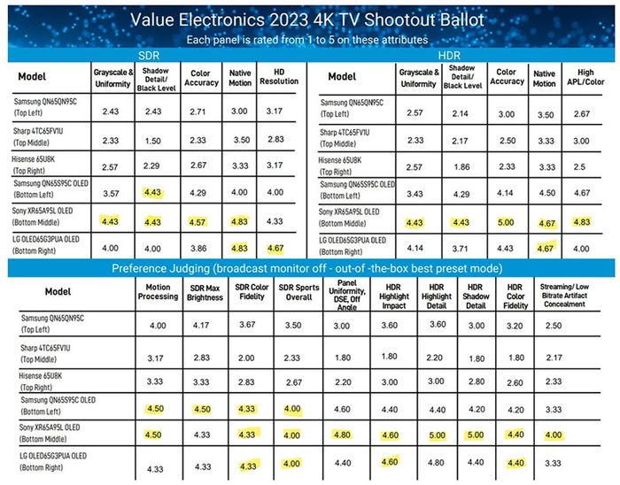 Cuộc thi bình chọn TV xuất sắc nhất năm 2023 “TV Shootout 2023” đã xác định chiếc tivi xuất sắc nhất trong hai hạng mục TV 4K và TV 8K. Trong hạng mục TV 4K, có 6 đối thủ tham gia, còn trong hạng mục 8K chỉ có 3 dòng tivi. Các chuyên gia về màu sắc, biên tập video,... sẽ đánh giá và chấm điểm các tivi dựa trên danh sách tiêu chuẩn từ 2 màn hình studio Trimaster HX BVM-HX310 của Sony. Điểm số cuối cùng được tính dựa trên sự tiếp cận chất lượng hiển thị so với màn hình tiêu chuẩn.