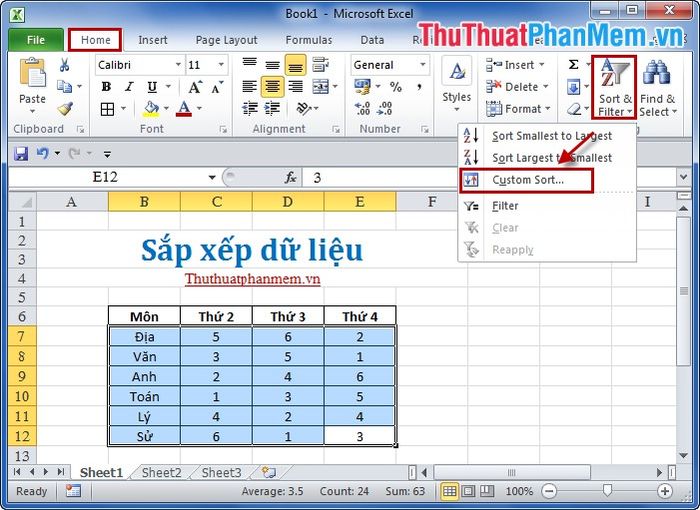 Step 2: You can customize the sort by selecting the data range to be sorted, choosing the Home tab -> Sort & Filter -> Custom Sort.