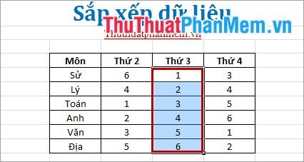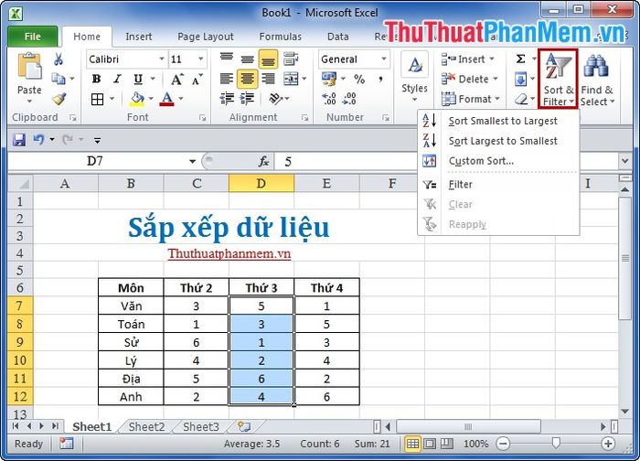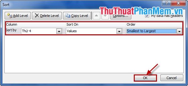 + If you select Sort Smallest to Largest, the sorted result will be as follows: