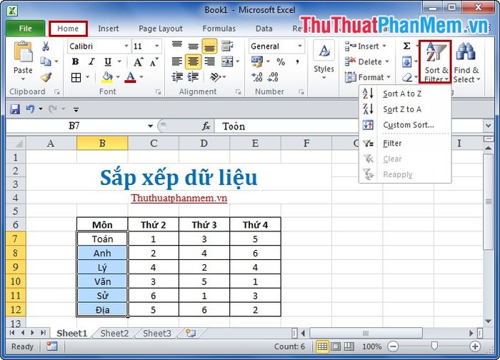 - If you wish to sort a column of text data, when choosing Sort & Filter, you will have sorting options: Sort A to Z (sort from A to Z), Sort Z to A (sort from Z to A).