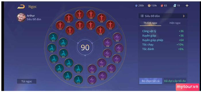 Giáo án Arthur full kiếm yêu cầu một bảng ngọc giàu sát thương. Với ngọc đỏ và tím, hãy ưu tiên chọn Công Vật Lý/Xuyên Giáp để tăng chỉ số chính của trang bị và thêm chút độ cơ động từ Tốc Chạy. Vì Arthur sử dụng chiêu thức gây sát thương phép, hãy chú ý đến ngọc xuyên giáp phép cho dòng này.