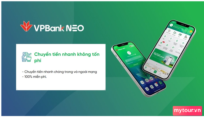 Giao dịch qua VPBank NEO hoàn toàn miễn phí, bao gồm cả chuyển tiền trong và ngoài mạng ngân hàng. Đặc biệt, bạn có thể thanh toán online và offline bằng mã QR tại hàng nghìn điểm đối tác của VPBank, mang lại trải nghiệm thanh toán hiện đại và tiện lợi.
