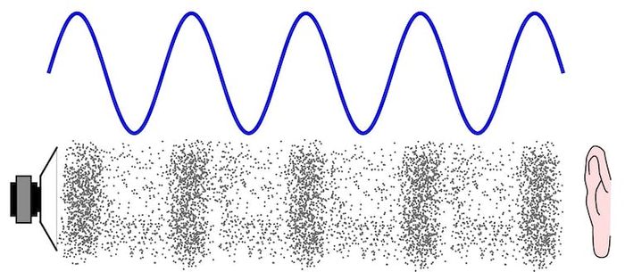 Sound is simply a series of low pressure and high pressure areas where air molecules, represented by the small dots, compress or spread apart. Pluke/WikimediaCommonsÂm thanh thực sự là gì?