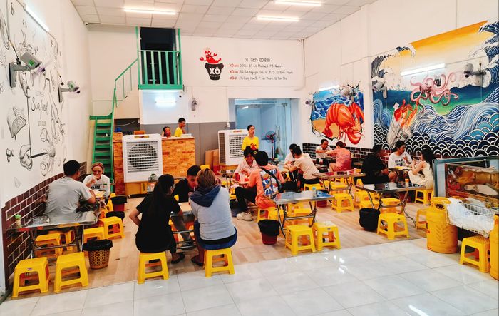 Bên cạnh đó, hải sản xô Bình Thạnh còn được trang trí bằng những hình vẽ và hoa tiết độc đáo, tạo điểm nhấn thu hút. Với không gian nhỏ, quán sử dụng ánh sáng trắng của đèn khôn xiết, tạo hiệu ứng thoáng đãng, mát mẻ.