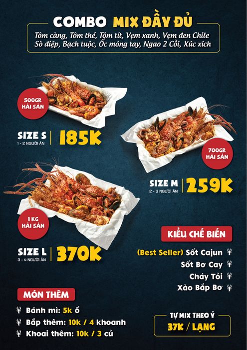 Để giúp khách hàng tiết kiệm chi phí mà vẫn thưởng thức đa dạng hải sản tươi ngon, Hải sản xô Bình Thạnh cung cấp dịch vụ combo mix đầy đủ các món như tôm càng, tôm thẻ, tôm tít, vẹm xanh, vẹm đen, sò điệp, ốc móng tay, bạch tuộc, ngao, xúc xích.