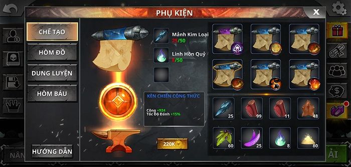 Người chơi cũng có khả năng nâng cấp phụ kiện bằng cách sử dụng các trang bị tương tự để rèn luyện. Việc nâng cấp sẽ gia tăng thêm các chỉ số của các phụ kiện.