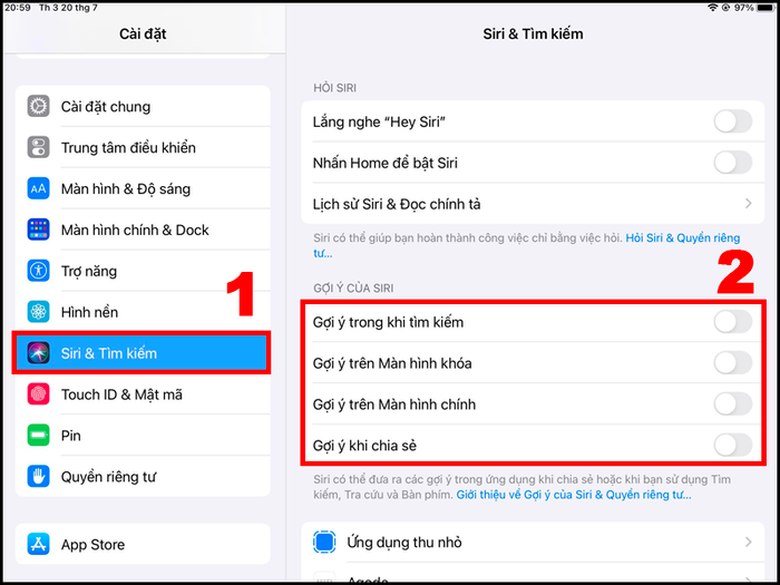 Ngoài ra, bạn có thể vô hiệu hóa tính năng tìm kiếm Spotlight nếu không sử dụng. Đơn giản, vào Cài đặt > Chọn Siri & Tìm kiếm và tắt tất cả 4 mục Gợi ý.