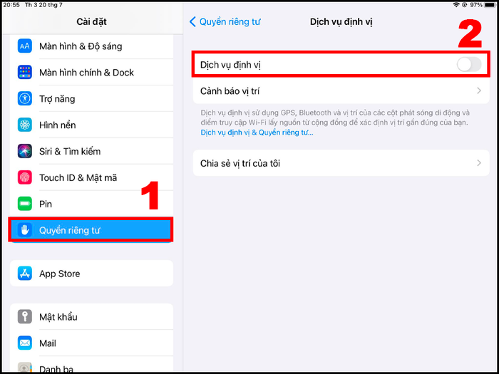 Thường thường, nếu không sử dụng chức năng định vị, bạn có thể tắt tính năng này để tránh làm nặng máy. Để thực hiện, vào Cài đặt > Chọn Quyền riêng tư > Tại mục Dịch vụ định vị, bạn gạt tắt Dịch vụ định vị.