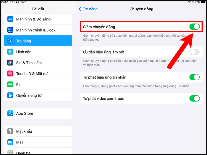 - Bước 2: Tại đây, bạn kích hoạt tính năng Giảm chuyển động.