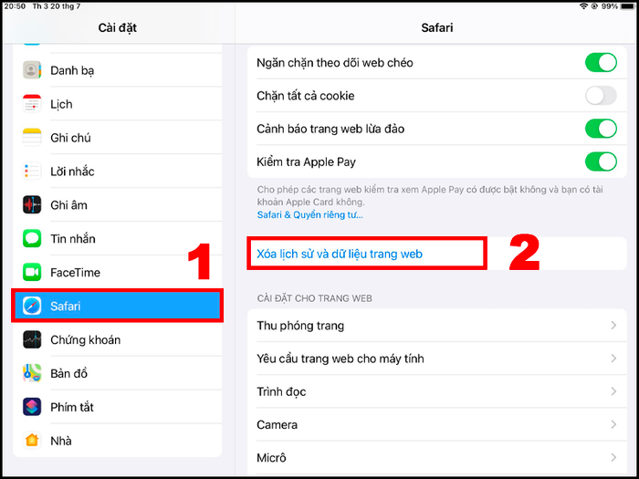 Một cách khác để giảm tải cho máy là xoá bộ nhớ đệm của Safari. Chỉ cần vào Cài đặt > Chọn Safari và ấn Xóa lịch sử và dữ liệu trang web. Việc này giúp làm trống bộ nhớ đệm, giảm gánh nặng cho máy.