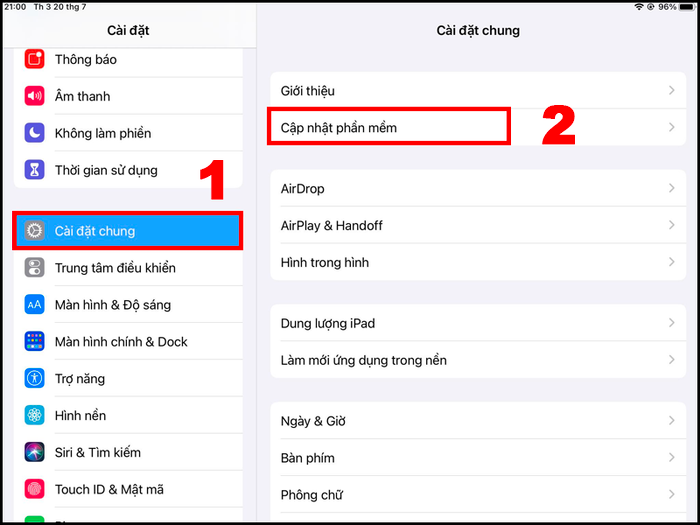Một trong những nguyên nhân khiến iPad hoạt động chậm có thể là do hệ điều hành hiện tại quá cũ, không tương thích với các ứng dụng hiện có. Hãy giải quyết vấn đề này bằng cách vào Cài đặt > Chọn Cài đặt chung và nhấn Cập nhật phần mềm để đảm bảo bạn đang chạy phiên bản iPadOS mới nhất.
