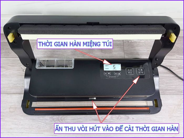 Cụ thể, hãy thu vòi hút và sử dụng các phím giảm hoặc tăng để chọn thời gian phù hợp với loại túi bạn đang sử dụng. Thời gian hàn miệng túi tối đa là 15 giây. Đối với túi chân không, thời gian dao động từ 5-7 giây, còn túi zip/túi màng nhôm/túi giấy kraft dao động từ 8-10 giây.