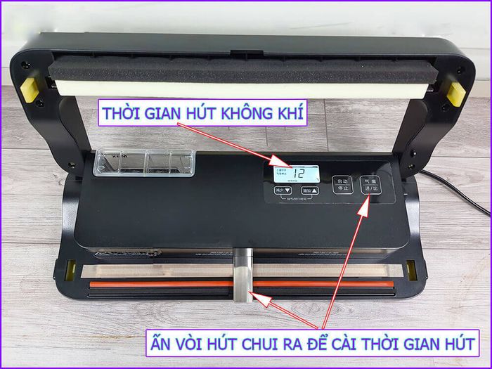 Nếu bạn muốn thiết lập thời gian hút chân không, hãy kích hoạt vòi hút bên ngoài và sử dụng nút giảm/tăng để điều chỉnh. Thời gian tối đa cho máy hút chân không là 99 giây, trung bình dao động từ 12-15 giây. Đối với bao bì thực phẩm ướt, bạn cần tăng thời gian.