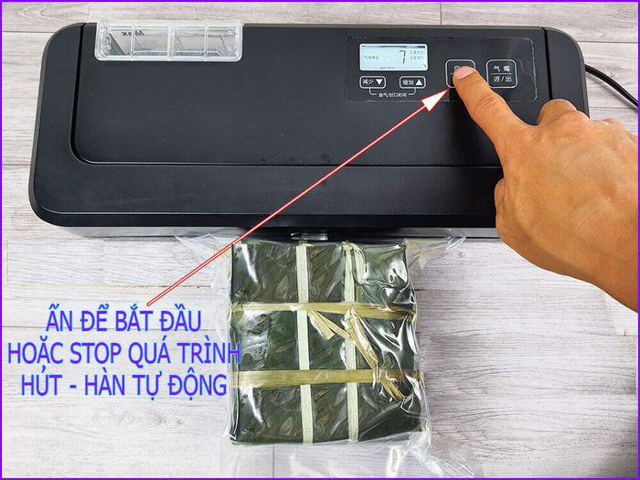 Bước 4: Nhấn vào nút start/stop để kích hoạt máy hút chân không. Khi bạn nhấn nút và thu vòi hút vào, máy sẽ tự động hiểu rằng chỉ cần hàn miệng túi mà không hút.