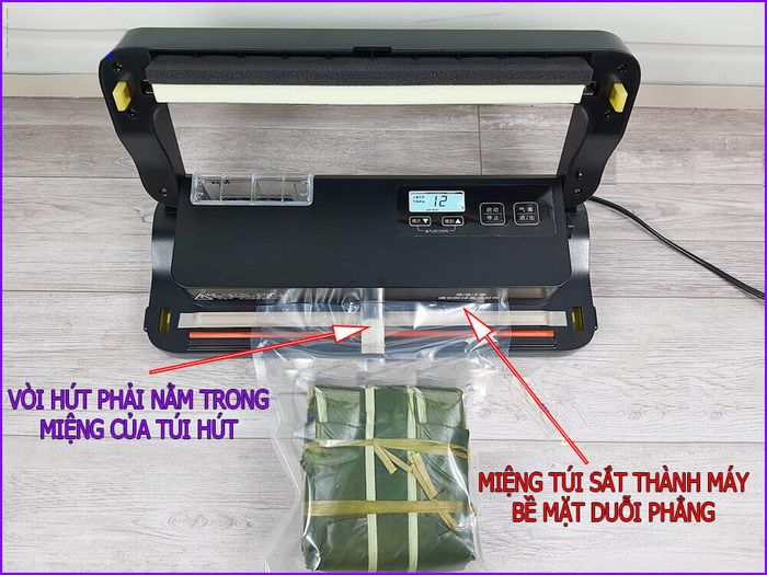 Bước 2: Tiếp theo, đặt miệng túi cần hàn vào thiết bị và đảm bảo vòi hút được thu vào đúng vị trí.