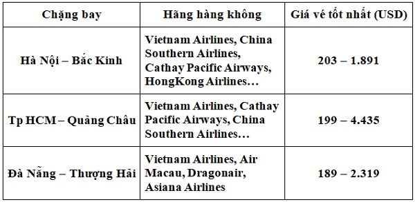 Thông tin về các chuyến bay và giá vé từ Việt Nam đến Trung Quốc.