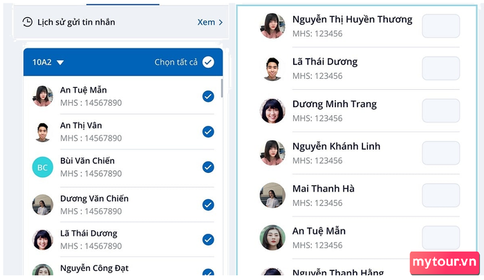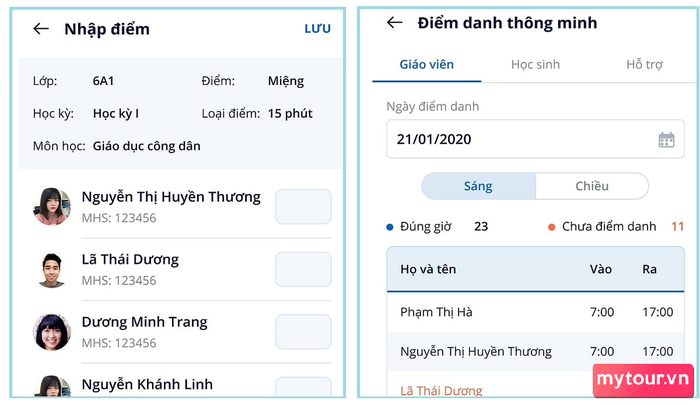 Điểm danh cũng trở nên đơn giản và thú vị hơn. Giáo viên có thể sử dụng nhiều hình thức điểm danh như chọn ngẫu nhiên hoặc theo thứ tự danh sách. Thông tin điểm danh bao gồm giờ vào, giờ ra và áp dụng cho cả ca sáng và chiều.