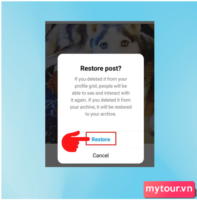một lần nữa để xác nhận bạn muốn khôi phục ảnh này. Qua đó, bạn đã thực hiện thành công cách phục hồi 1 ảnh trên Instagram.