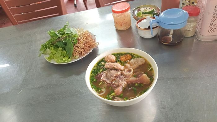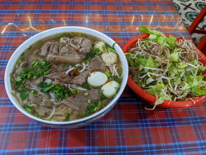 Bát bún to, đầy ắp đủ từ móng, mọc, thịt, thịt bò, tiết khiến thực khách mê mẩn. Nước lèo thơm mùi sả và hành hoa, vị ngọt dịu của xương hầm đúng độ, không quá nhiều mỡ nên không bị ngấy, kết hợp với tí ớt cay cay, măng chua chua, tạo nên hương vị đậm đà, thơm ngon khó cưỡng. Sợi bún mềm trơn, dai dẻo, trắng sáng tự nhiên. Thịt bò được thái thành miếng to, ngon miệng. Đặc biệt, ăn kèm với nhiều loại rau thơm và nửa quả chanh, tạo điểm nhấn hoàn hảo cho mỗi bữa ăn.