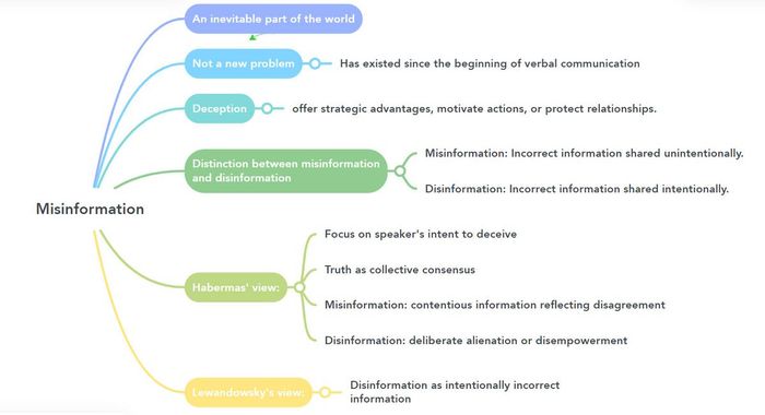 Does misinformation require intentional deceit on the part of the presenter? Philosopher Jürgen Habermas, who taught at institutions such as Goethe University Frankfurt and the Max Planck Institute in Germany until formally retiring in the 1990s, focuses on a speaker’s intent to deceive to distinguish between misinformation and disinformation. Habermas views truth as only possible collectively among people as a product of consensus; one’s collegial participation in such collective understanding also matters. Misinformation from such a perspective, then, is contentious information reflecting disagreement among people, whereas disinformation is more problematic, as it involves deliberate alienation or disempowerment of other people. Lewandowsky and his colleagues have carried forward this definition of disinformation as intentionally incorrect information." (Southwell, Thorson, and Sheble 368)