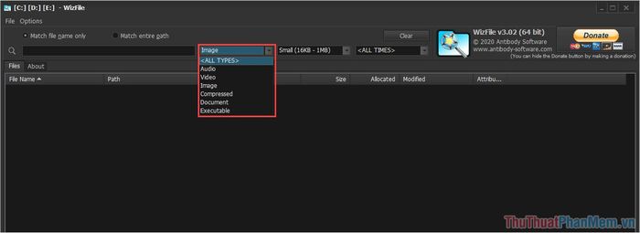 Bộ lọc cho phép chọn định dạng file để tìm kiếm chính xác. Chọn All Type nếu không biết định dạng.