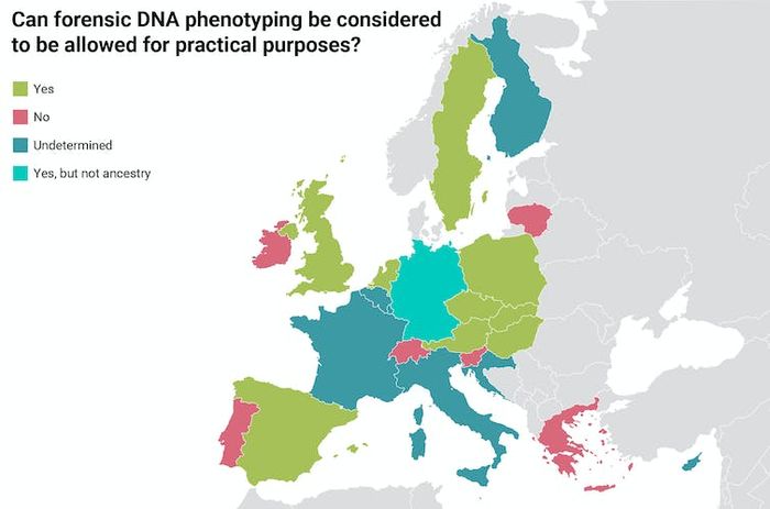 DNA-based prediction is used in some European countries and forbidden in others. Adapted from Schneider, Prainsack & Kayser/Dtsch Arztebl Int.Đức cho phép dự đoán các đặc điểm có thể nhìn thấy bên ngoài (bao gồm màu da) nhưng quyết định rằng nguồn gốc sinh học địa lý đơn giản là quá rủi ro để sử dụng.
