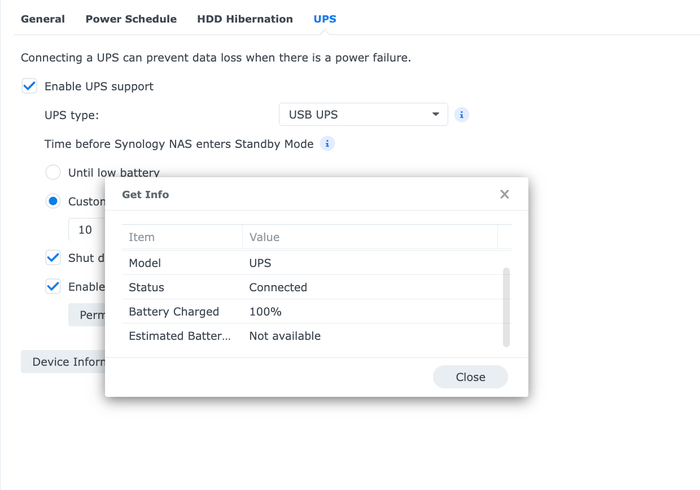 Tiếp theo, tích Enable UPS support, chọn USP type là USB UPS. Bây giờ, NAS đã kết nối đến UPS và bạn có thể xem thông tin của UPS tại Device Information. Tuy nhiên, có 2 điểm mà UPS của Prolink chưa được tốt lắm, mình không biết các thương hiệu khác có gặp vấn đề tương tự không.