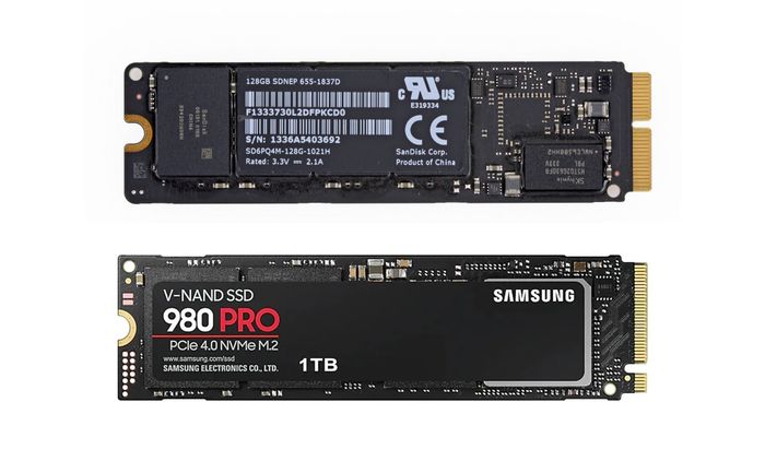 Những ổ SSD thông thường thường được gọi là 'phong kẹo cao su' kết nối qua cổng M.2, thường được biết đến với mã 2280 vì kích thước của nó: 22mm rộng và 80mm dài. Đây cũng là những mô hình SSD phổ biến nhất cho máy tính đồng bộ. Trong khi đó, trên thị trường laptop, yêu cầu về kích thước nhỏ gọn đã khiến nhiều nhà sản xuất chọn lựa giải pháp M.2 với kích thước 2230 hoặc 2242 để làm bộ nhớ lưu trữ cho các máy tính xách tay. So với những ổ cứng có kích thước 3.5 hoặc 2.5 inch, ổ SSD chuẩn M.2 thực sự gọn gàng và tiện lợi hơn nhiều.Nhưng vấn đề tiếp theo là tại sao khi mua SSD M.2 và cắm vào MacBook hoặc Mac mini thì không vừa, đặc biệt là trên những sản phẩm từ 2013 đến 2015?Apple có một lịch sử dài hơn một thập kỷ với SSD trong máy Mac. Mặc dù vẫn sử dụng chuẩn kết nối M.2 và tiêu chuẩn NVMe cho ổ cứng qua cổng PCI Express trên bo mạch chủ, nhưng họ luôn sử dụng chân kết nối M.2 khác biệt so với những ổ SSD thông thường. Ví dụ, SSD trên MacBook Pro từ 2013 đến 2015 và MacBook Air từ 2013 đến 2016 sử dụng chân kết nối khác biệt, có 11 + 14 chân kết nối với khe cắm M.2. Để so sánh, hãy xem SSD của MacBook 2013 so với Samsung 980 Pro: