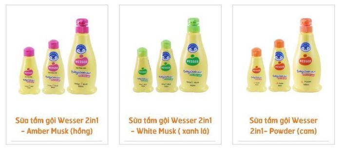 Hiện tại, sữa tắm gội Wesser có 2 loại: sữa tắm gội Wesser Nano Silver và sữa tắm gội Wesser Baby Wash 2in1, với 3 phiên bản màu sắc: hồng, xanh lá và cam, giúp phụ huynh dễ dàng lựa chọn theo nhu cầu và sở thích. Giá của sữa tắm Hàn Quốc cho bé Wesser dao động từ 39.000 vnđ – 150.000 vnđ/ chai (dung tích từ 100ml – 500ml) tùy vào nơi bán.