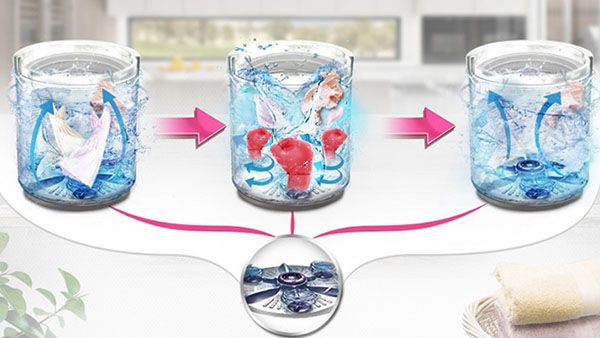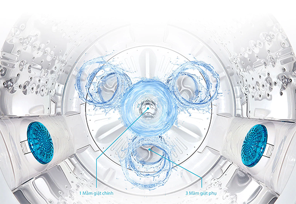 Trong quá trình giặt, áp lực từ đấm nước và sức mạnh thẩm thấu của xoáy nước từ 3 mâm giặt phụ liên tục đánh bại vết bẩn, nâng cao hiệu quả giặt sạch.