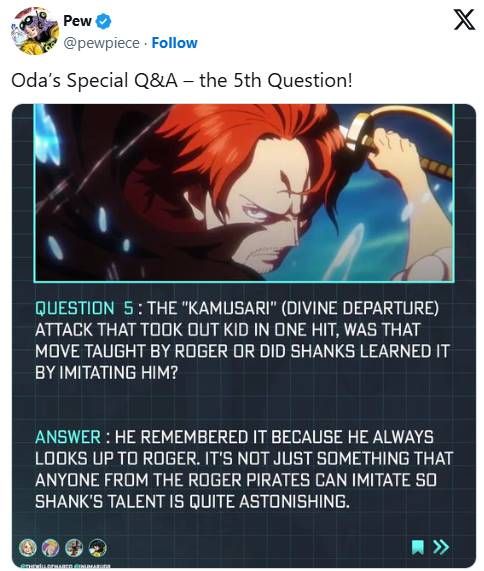 Oda đã đáp rằng: "Anh ta nhớ kỹ thuật đó vì luôn ngưỡng mộ Roger. Không phải ai trong băng hải tặc của Roger cũng có thể bắt chước được, vì vậy tài năng của Shanks thực sự rất đáng nể."