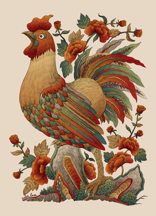 Tranh Tết truyền thống: Gà trống kết hợp hoa hồng