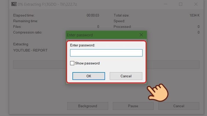 Nếu bạn lựa chọn Giải Nén Tại Đây, chỉ cần nhập mật khẩu và nhấn OK. Nếu không có mật khẩu, file sẽ được giải nén tự động.