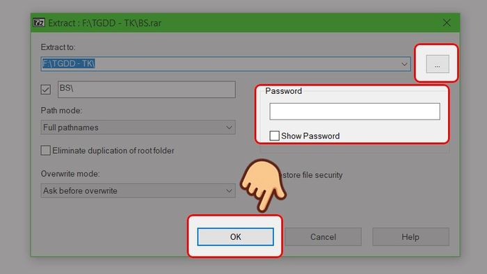 Nếu bạn chọn Giải Nén File, tại bảng hiển thị, click vào dấu ba chấm để chọn thư mục chứa file sau khi giải nén. Nhập mật khẩu (nếu có), nhấn OK, chương trình sẽ giải nén file vào thư mục bạn đã chọn.
