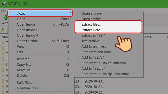 Bước 3: Click chuột phải vào file cần giải nén, chọn 7-Zip, sau đó sử dụng một trong hai lựa chọn sau: