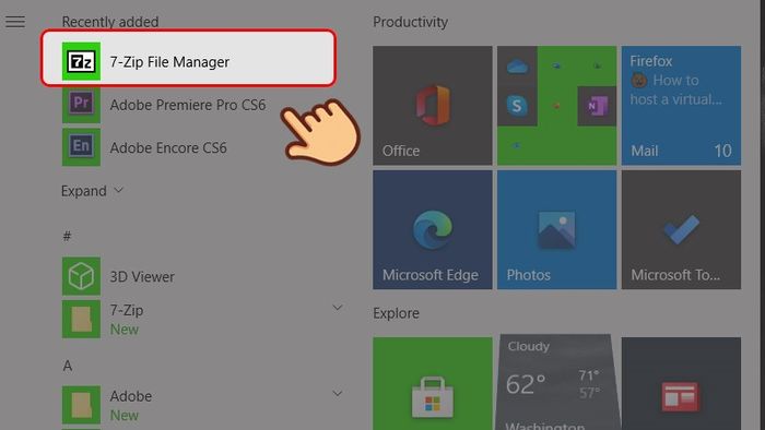 Bước 1: Mở Quản Lý File 7-Zip bằng cách click vào biểu tượng cửa sổ Windows và chọn 7-Zip File Manager.