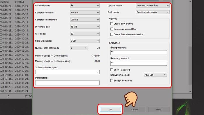 Bước 5: Bạn có thể điều chỉnh một số thiết lập như định dạng nén, mức độ nén, mật khẩu cho file nén,... sau đó nhấn OK.