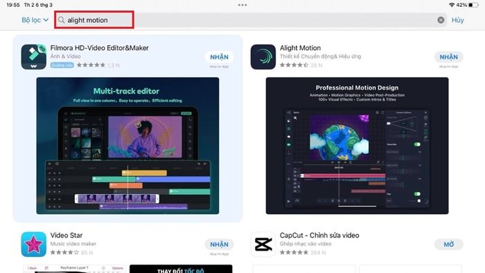 Đầu tiên, mở ứng dụng App Store trên iPhone hoặc iPad của bạn. Sau đó, nhập từ khóa “Alight Motion” vào ô tìm kiếm.