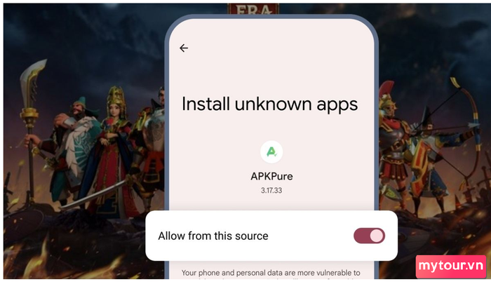 Bước 3: Trong quá trình tải xuống, bạn có thể nhận thông báo về nguồn ứng dụng. Hãy chọn Allow hoặc cho phép quá trình cài đặt tiếp tục. Chờ quá trình tải Era of Conquest apk hoàn tất, bạn có thể trải nghiệm trò chơi ngay.