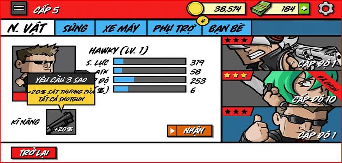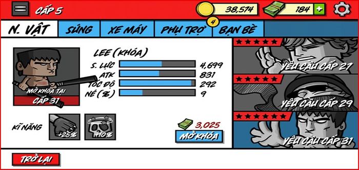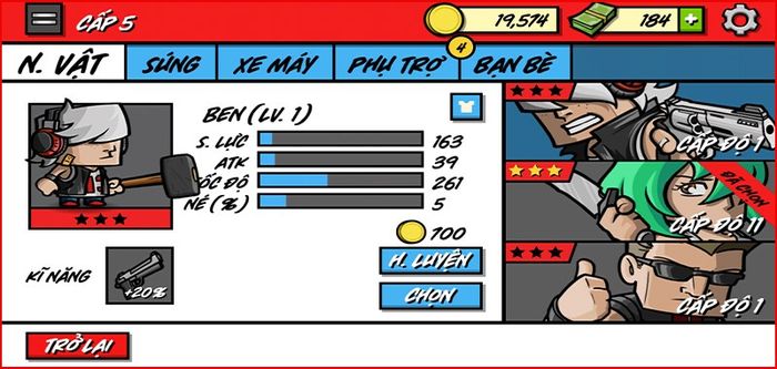 Bạn có thể nâng cấp các nhân vật của mình để họ trở nên mạnh mẽ hơn: tăng tốc độ di chuyển, sức chịu đựng hoặc sát thương tại thông tin nhân vật.