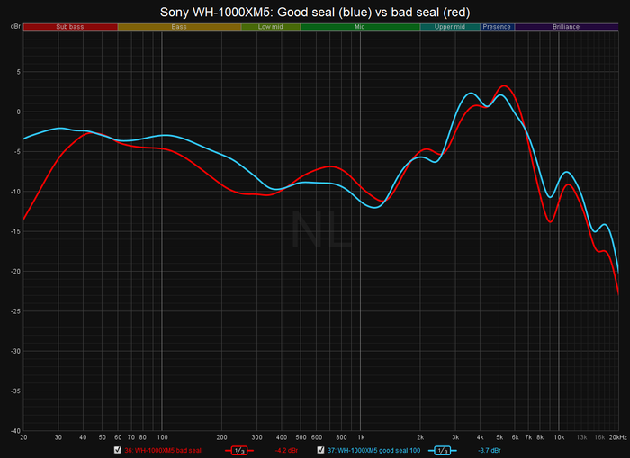 Màu xanh là hiệu suất của tai nghe với độ kín đúng. Tôi không tìm thấy một bộ tóc giả phù hợp với kiểu tóc của mình kịp thời cho bài viết, nên đường cong màu đỏ cho thấy cách tai nghe tương tự hoạt động sau khi đặt một cặp kính trên máy đo cho độ kín lỏng lẻo.
