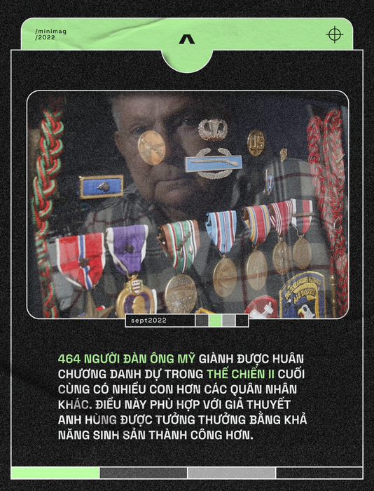 Dữ liệu từ một nghiên cứu khác cho thấy 464 người đàn ông Mỹ được trao Huân chương Danh dự trong Thế chiến II, họ cuối cùng cũng có nhiều con hơn so với những người lính không được trao huân chương. Điều này hỗ trợ giả thuyết rằng lòng dũng cảm được tưởng thưởng thông qua khả năng sinh sản thành công hơn.
