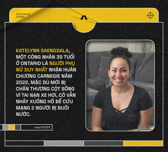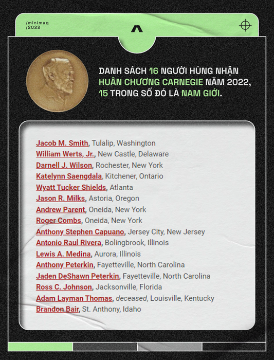 Quay lại với Huân chương Carnegie, giải thưởng dành cho những cá nhân dũng cảm, hy sinh bản thân để cứu sống người khác. Như đã đề cập, năm 2022 có 16 Huân chương Carnegie được trao, trong đó 15 người là nam giới.