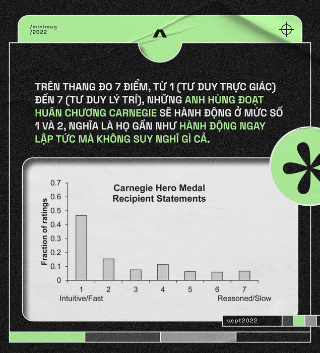 Điều này đưa chúng ta trở lại cuộc phỏng vấn với những người nhận Huân chương Carnegie. 51 trong số họ tiết lộ: Để thực hiện hành động anh hùng, bạn cần hành động theo trực giác, không được phép suy nghĩ hay toan tính.