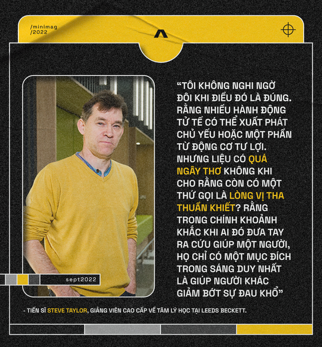 Nhưng liệu có quá ngây thơ khi nghĩ rằng còn một khía cạnh được gọi là lòng vị tha thuần khiết? Rằng trong khoảnh khắc một ai đó chạm đến để giúp đỡ người khác, họ chỉ có một mục đích duy nhất là giảm bớt đau khổ cho người khác', tiến sĩ Steve Taylor, giảng viên tâm lý học tại Đại học Leeds Beckett, Vương Quốc Anh, đã chia sẻ.