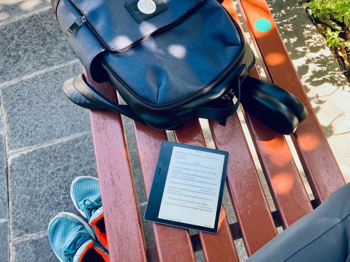 Để hiểu rõ hơn về màn hình e-ink trên máy đọc sách, hãy tưởng tượng rằng dưới ánh sáng mặt trời, màn hình trắng của nó sẽ giống như tờ báo, hơi xám một chút nhưng văn bản vẫn rất rõ ràng. Màn hình trên Kindle được thiết kế chống chói, kể cả khi đọc ngoài trời dưới ánh nắng mặt trời cũng không bị lóa như khi sử dụng smartphone. Mình đã thử đọc trên điện thoại (Galaxy Fold) và phát hiện rằng vấn đề lớn nhất là lóa mắt, thậm chí ngay cả khi đọc trong nhà dưới ánh đèn cũng dễ bị lóa.Tập trung hơn vào việc đọc