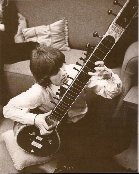 Hình ảnh George Harrison và cây đàn sitar (năm 1965). George được biết đến như sự kết hợp hoàn hảo giữa tài năng của Paul McCartney và phong cách độc đáo của John Lennon.