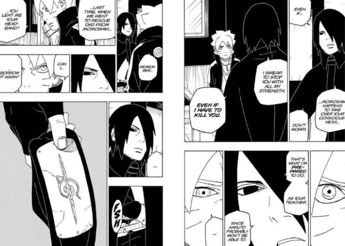 Trong chương 49 của manga Boruto: Naruto Next Generation, trước khi rời đi để hỗ trợ Naruto đối đầu với Isshiki, Sasuke nhận thấy sự lo lắng của Boruto. Đệ tử của anh lo sợ Momoshiki sẽ chiếm lấy cơ thể cậu. Sasuke cam kết sẽ ngăn chặn đệ tử, thậm chí phải hy sinh cậu nếu cần. Với sự thiếu can đảm của Naruto, Sasuke tự mình đảm bảo an tâm cho Boruto.